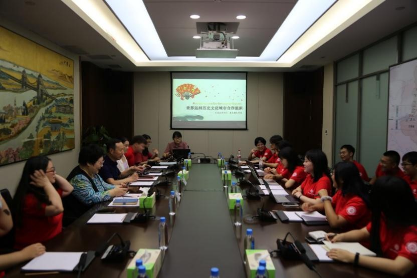 为深入理解大运河在推进“一带一路”建设中的价值,课程团队前往世界运河历史文化城市合作组织(World Historic and Cultural Canal Cities Cooperation Organization,以下简称世界运河组织)调研。世界运河组织正式成立于2009年,旨在以运河为纽带,促进运河城市间经济文化交流,共享发展经验,推动互利合作,目前已有全球各地的92座运河城市加入。26日上午,团队首先来到了位于京杭大运河畔的世界运河城市论坛永久会址——京杭国际会议中心,世界运河组织副主席张福堂与秘书长邓清亲切接见了课程团队,带领师生参观了论坛会址和秘书处。