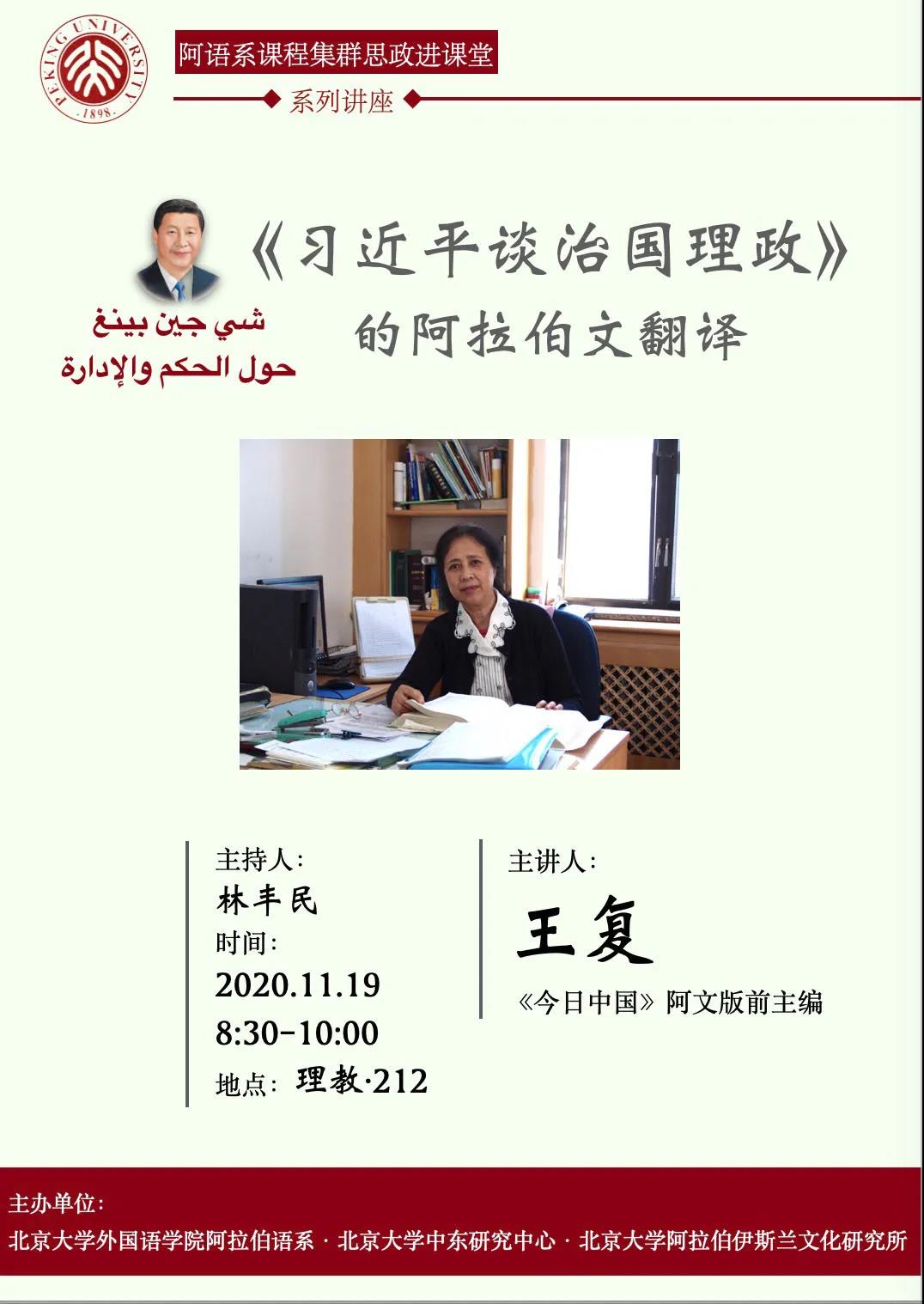 2020年11月19日上午,beat365平台唯一官网阿拉伯语系课程集群思政进课堂系列讲座邀请外文局资深翻译专家王复老师做第一次讲座,为阿语系师生带来了一场既有语言翻译收获,又提升思想的生动课堂。她主讲的题目是“《习近平谈治国理政》的阿拉伯文翻译”。
