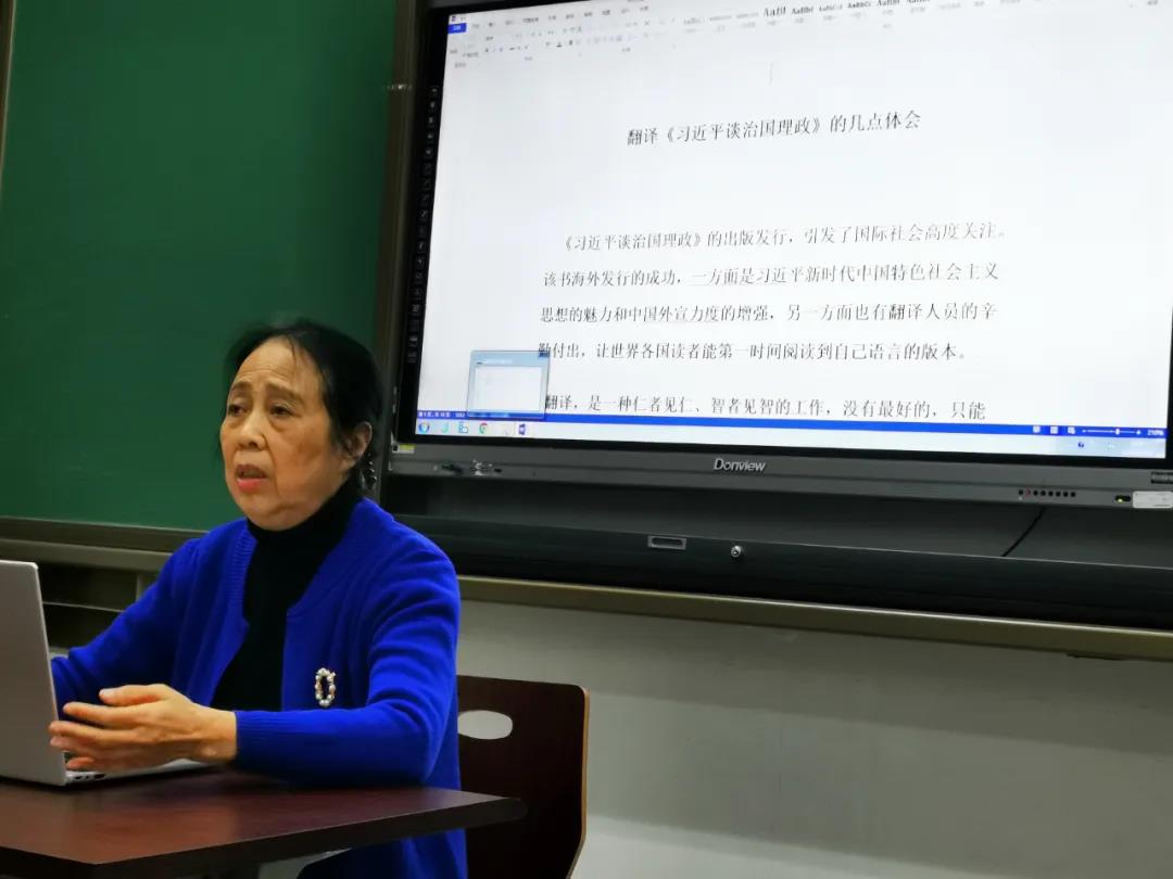 王复老师从《习近平谈治国理政》的题目翻译出发,从词语的选择以小见大,提出要在翻译中强化中国表达,提升中国话语权。例如,“中国梦”这个看似简单的词组,为什么应选择使用正偏组合,王复老师解释说,中国梦是中国人自己的梦想,是要实现中华民族伟大复兴,使用正偏组合表达更清晰,不会引起歧义。此外,王复老师还对“中国特色社会主义道路”“小康社会”“大国外交”“改革进行时”等中国特色词汇的翻译进行了细致讲解,其对翻译一丝不苟的态度令人肃然起敬。