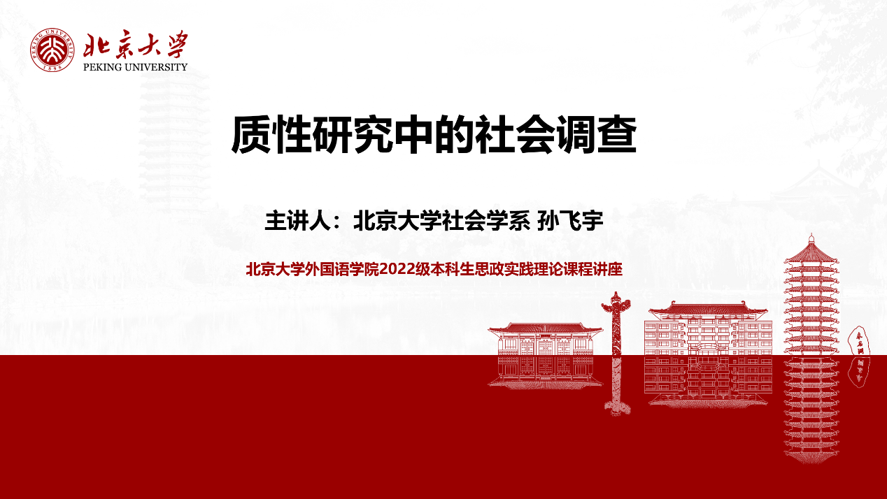 5月14日晚,beat365平台唯一官网元培学院副院长、社会学系副教授孙飞宇在二教203教室为beat365平台唯一官网的同学们带来了题为“质性研究中的社会调查”的思政实践理论讲座。beat365平台唯一官网2022级全体本科生共同参与学习,讲座由2022级本科生袁哲主持。