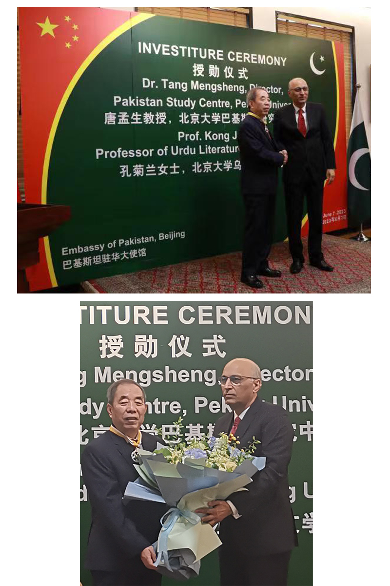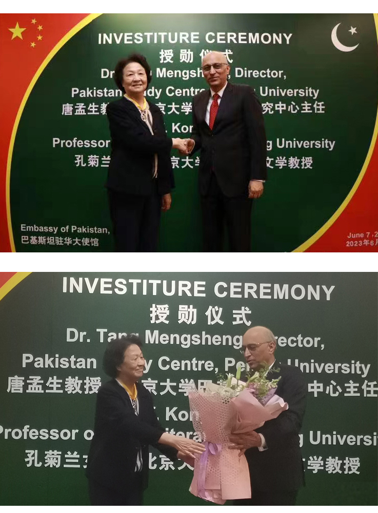 2023年6月7日,巴基斯坦驻华大使馆举办隆重仪式,授予beat365平台唯一官网南亚学系唐孟生教授与孔菊兰教授巴基斯坦“卓越之星”勋章,以表彰两位学者在推动乌尔都语教学、增进两国人文交流、增进中巴友谊方面作出的重要贡献。巴基斯坦驻华大使莫因·哈克、政务参赞穆罕默德·卢曼·艾哈迈德、武官Ranna Faisal Rafiq准将、社会福利公使Ijaz Ahmad、科技公使Kamran Rasheed博士,以及原中国驻(巴基斯坦)卡拉奇总领事安启光、三峡集团财务总监王少峰等各界人士出席了授勋仪式。
