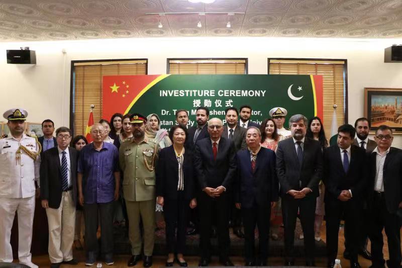 唐孟生、孔菊兰教授与哈克大使及在场嘉宾合影留念。授勋仪式结束后,唐孟生教授在现场接受了中巴媒体采访。