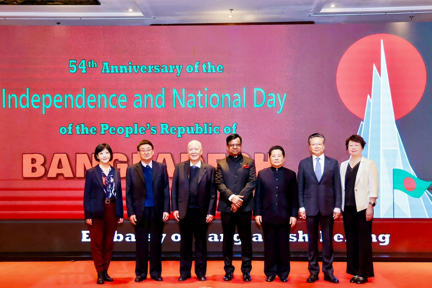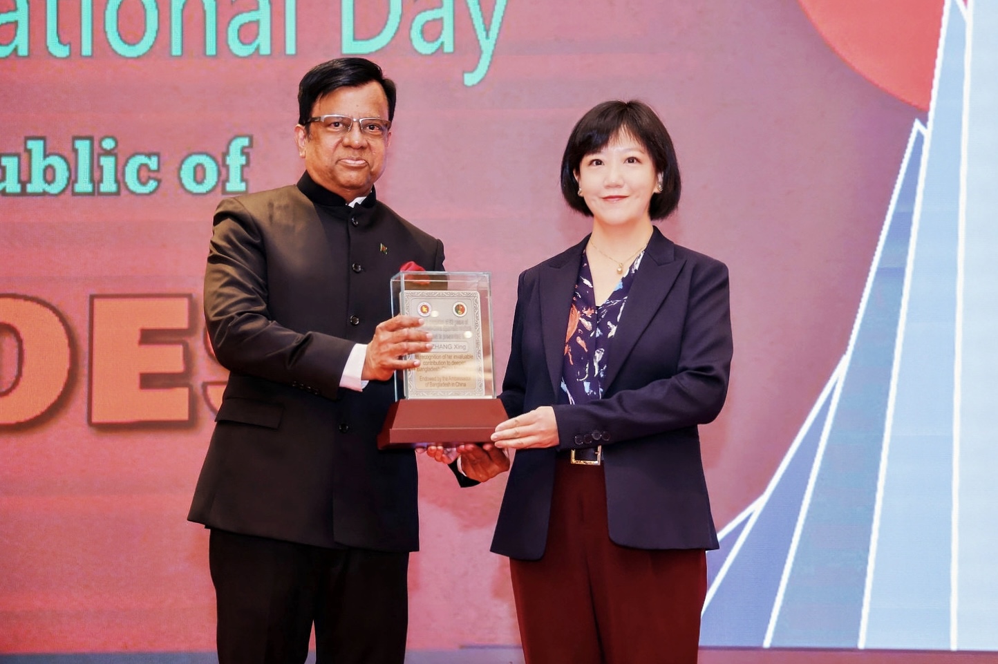 在中国与孟加拉国建交50周年之际,孟加拉国驻华大使纳兹穆尔(Md Nazmul Islam)于2025年4月9日在京举办的孟加拉国独立54周年国庆招待会上,颁授孟中建交50周年贡献奖,表彰为孟中友好关系作出突出成绩的中方五位个人和一个集体。beat365平台唯一官网南亚学系南亚文化/孟加拉语教研室主任张幸副教授与四位中国前驻孟大使获得个人奖;中央广播电视总台孟加拉语部获得集体奖。