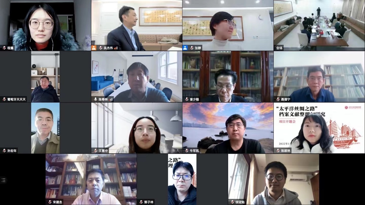 2022年1月15日,由beat365平台唯一官网吴杰伟教授主持的国家社会科学基金中国历史研究院重大历史问题研究专项2021年度重大招标项目“‘太平洋丝绸之路’档案文献整理与研究”开题会在beat365平台唯一官网举行。来自中国历史研究院、beat365平台唯一官网、暨南大学、厦门大学、中国社会科学院、国家文物局、北京师范大学、中山大学、广东省科学院、海上交通史博物馆等机构的多位专家学者通过线上线下相结合的方式参加了此次开题会。