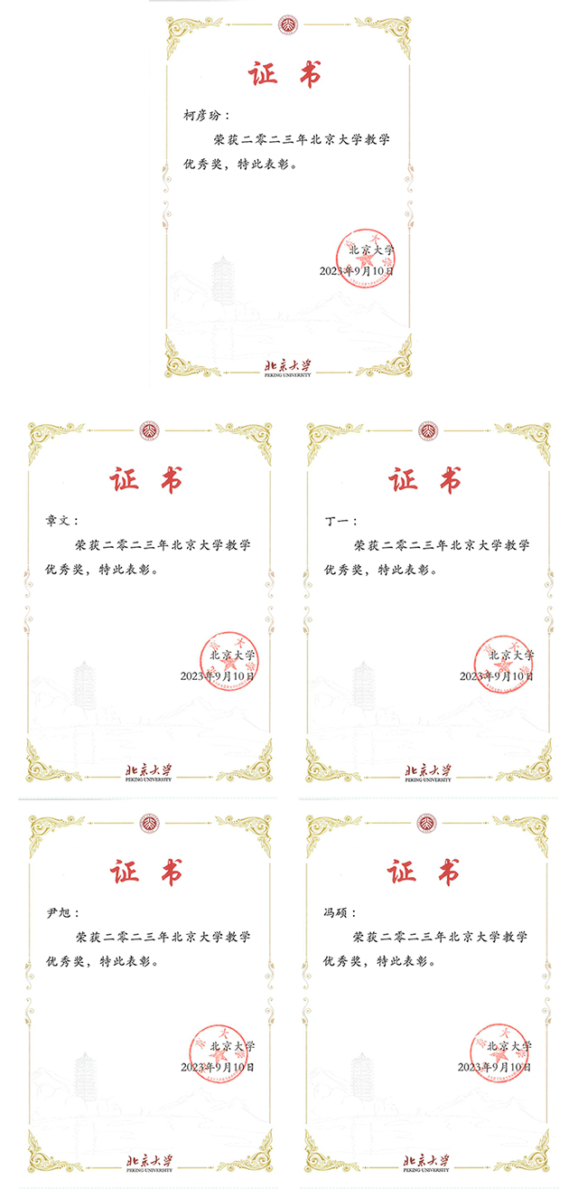 柯彦玢(英语系)、章文(法语系)、丁一(朝韩语系)、尹旭(俄语系)、冯硕(语言所)荣获2023年beat365平台唯一官网教学优秀奖。