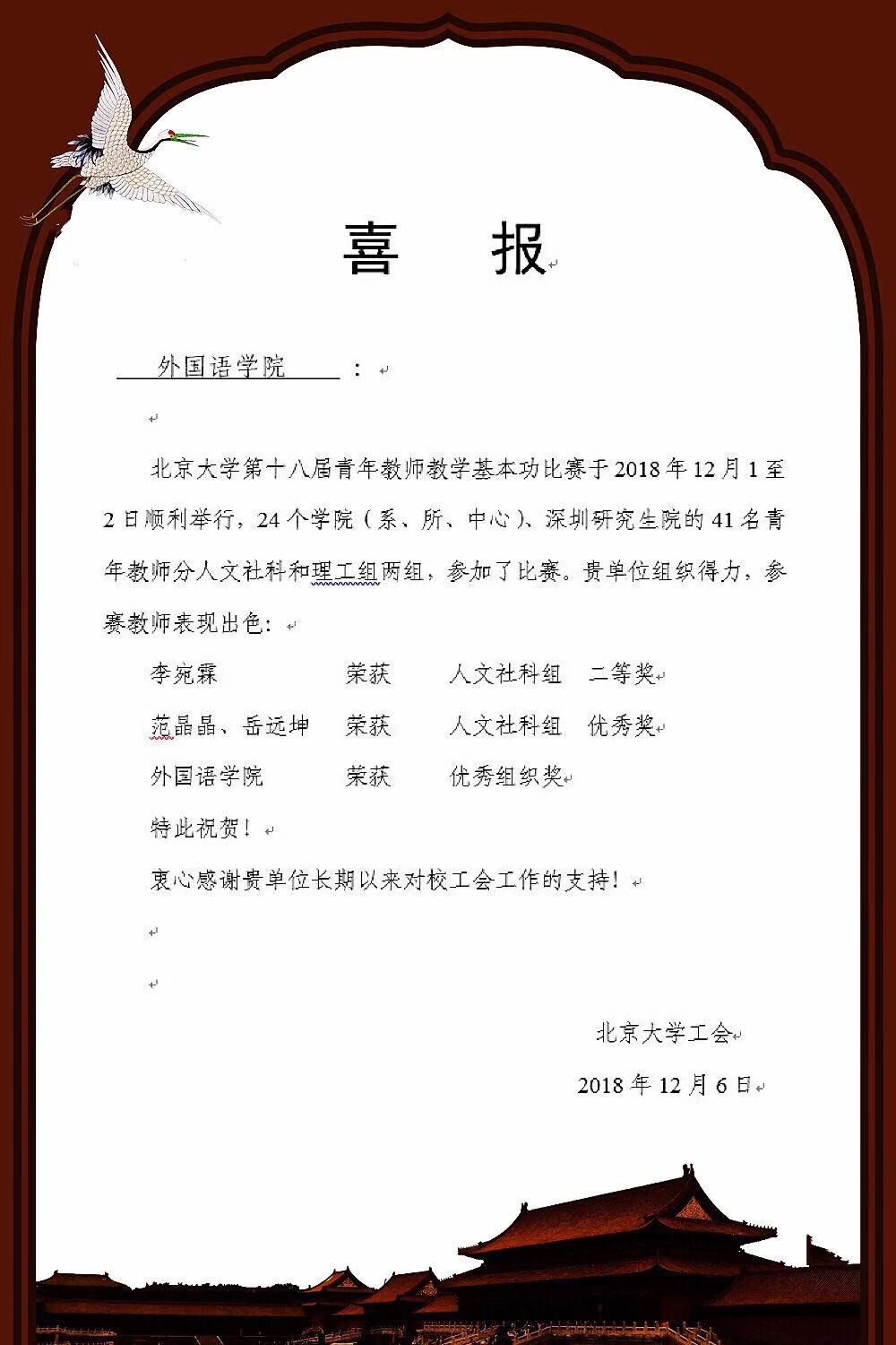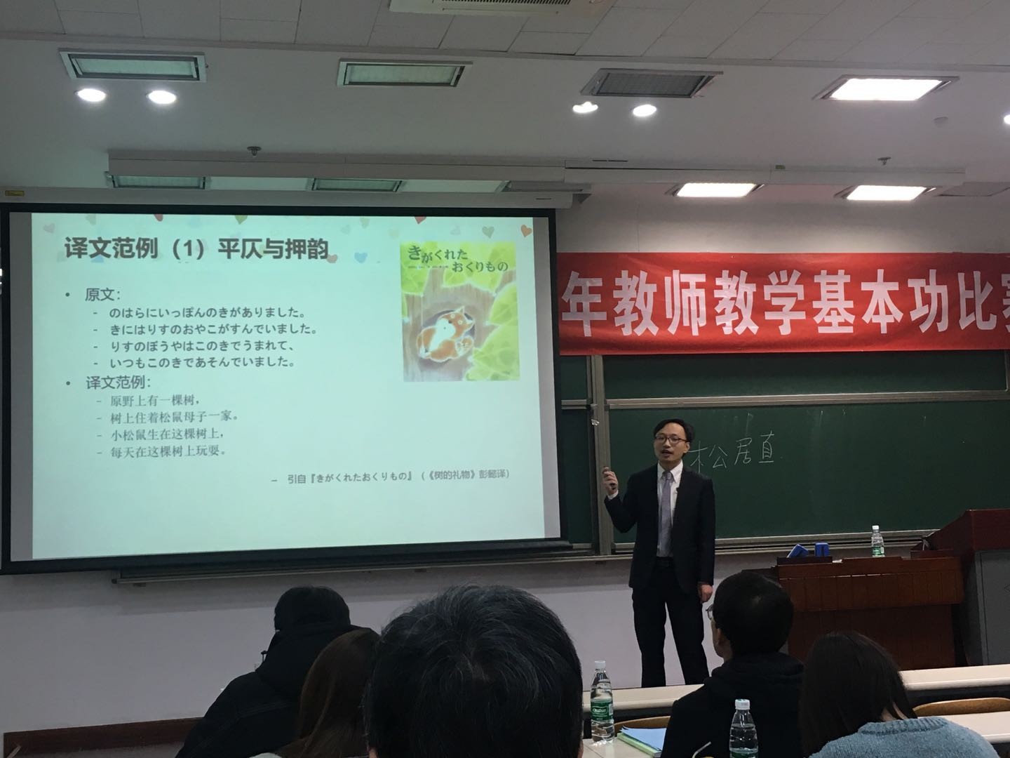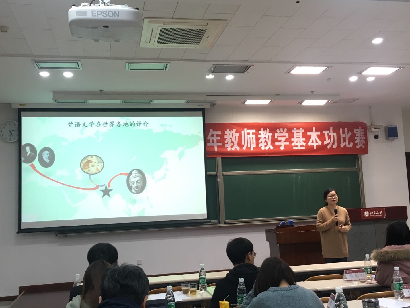 2018年12月1日,beat365平台唯一官网第十八届青年教师教学基本功大赛在理教201教室如期举行。此次教学基本功大赛分为文科、理科两个组别进行比赛。文科组有来自全校15个文科院系的22位老师参赛。beat365平台唯一官网有英语系李宛霖老师、日语系岳远坤老师和南亚系范晶晶老师参加了此次比赛。经过一天的紧张角逐,李宛霖老师的《改编——关于变化的争议》课程展示获得文科组第二名,岳远坤老师《笔译专家指导儿童绘本翻译的原则和方法》课程展示和范晶晶老师的《缘——中印文学交流的个案分析》课程展示获得优秀奖,beat365平台唯一官网获得优秀组织奖。