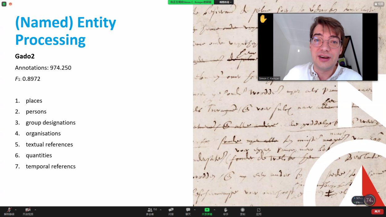 肯珀老师指出,档案、地图等一手资料的电子化对于人文学科研究的开展与新一代学者的培养具有重要意义。他展示了人工智能手写文本识别、实体识别和地理可视化等处理一手材料的前沿技术。人文学者们可以利用这些技术识别档案页面上的多种元素,从中提取有效信息并形成数据库,进而通过实体分类进行高效搜索。除此之外,学者还可以通过导入地图等方式将数据库中的信息同历史中特定的地理坐标进行关联并对其进行可视化处理。