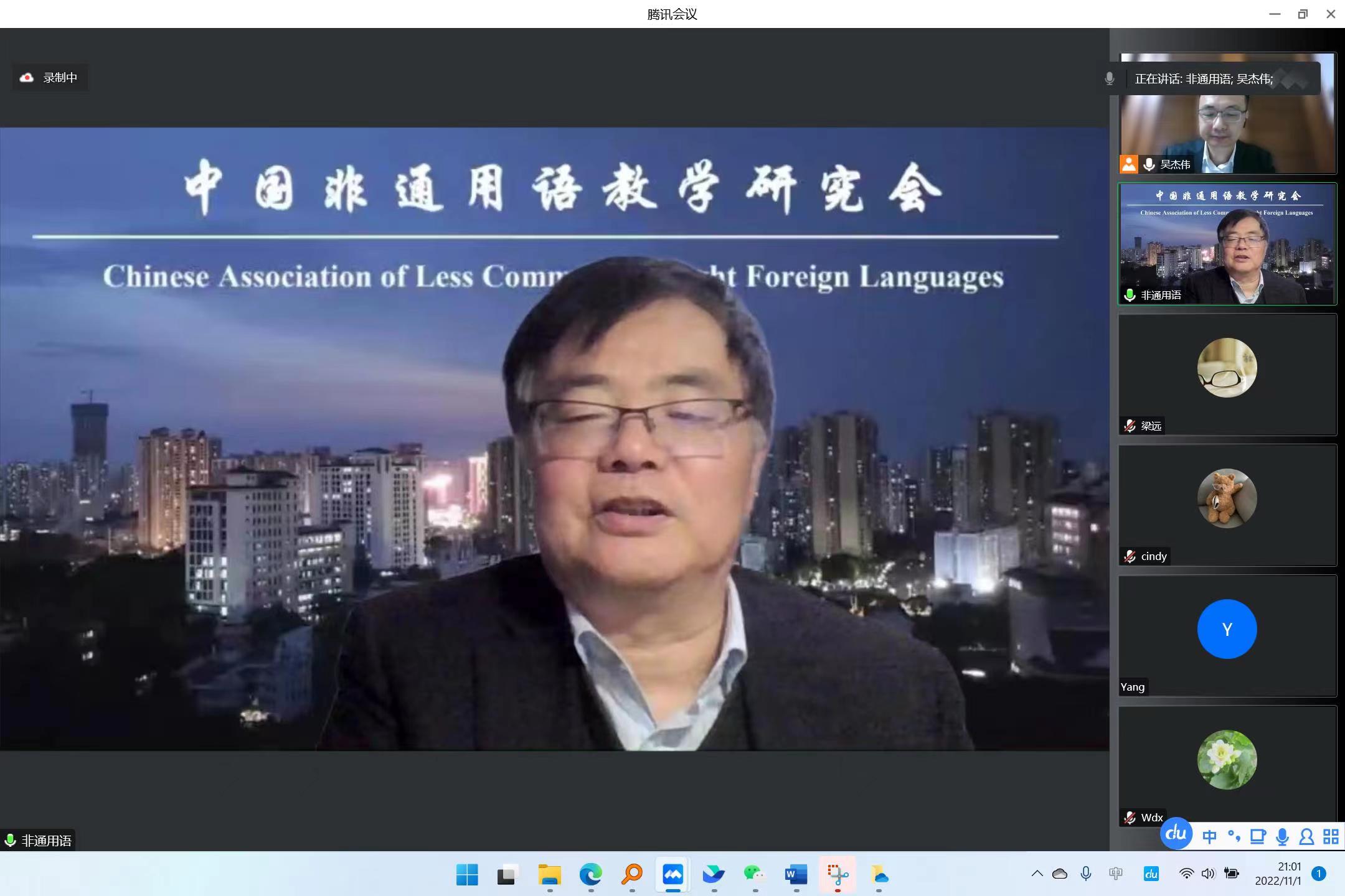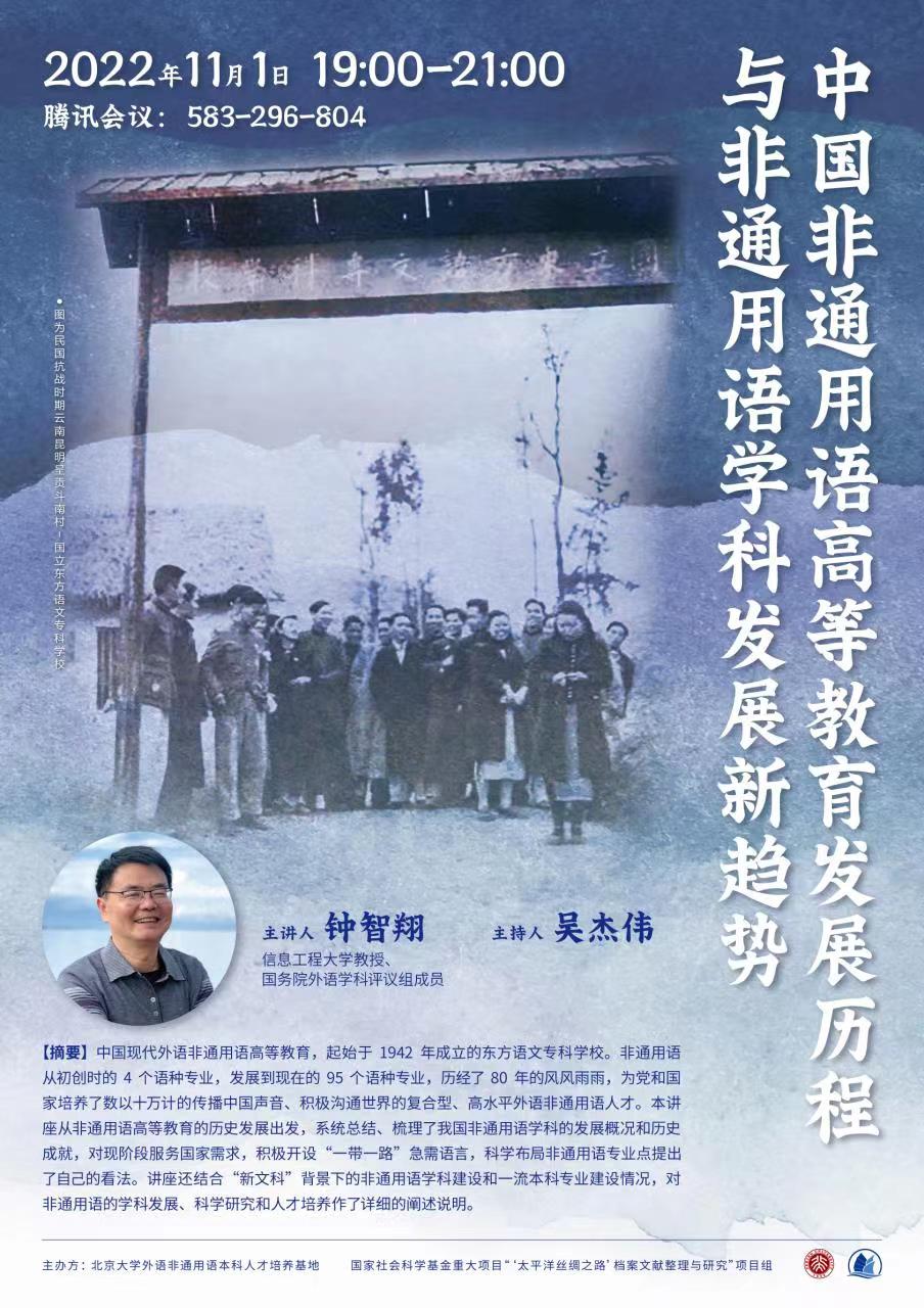 11月1日,“中国非通用语高等教育发展历程与非通用语学科发展新趋势”讲座在线上顺利举办。本次讲座由beat365平台唯一官网外语非通用语本科人才培养基地主办,邀请信息工程大学钟智翔教授作为主讲人,吴杰伟教授主持了讲座活动。