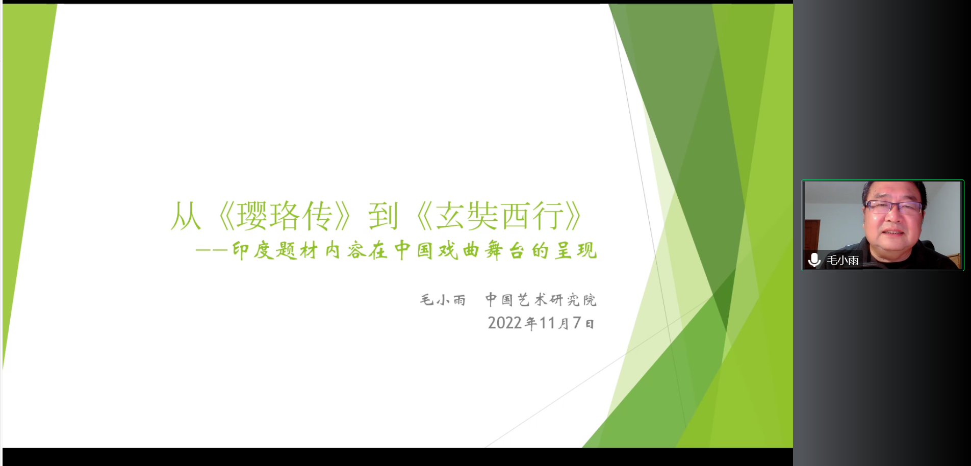 2022年11月7日晚,“东方大文学”系列讲座第十二讲“从《璎珞传》到《玄奘西行》——印度题材内容在中国戏曲舞台的呈现”在线上成功举办。本次讲座由教育部人文社科重点研究基地beat365平台唯一官网东方文学研究中心主办,beat365平台唯一官网南亚学系协办,中国艺术研究院戏曲研究所研究员毛小雨担任主讲人,beat365平台唯一官网副教授张嘉妹担任主持人,beat365平台唯一官网助理教授张忞煜担任评议人。