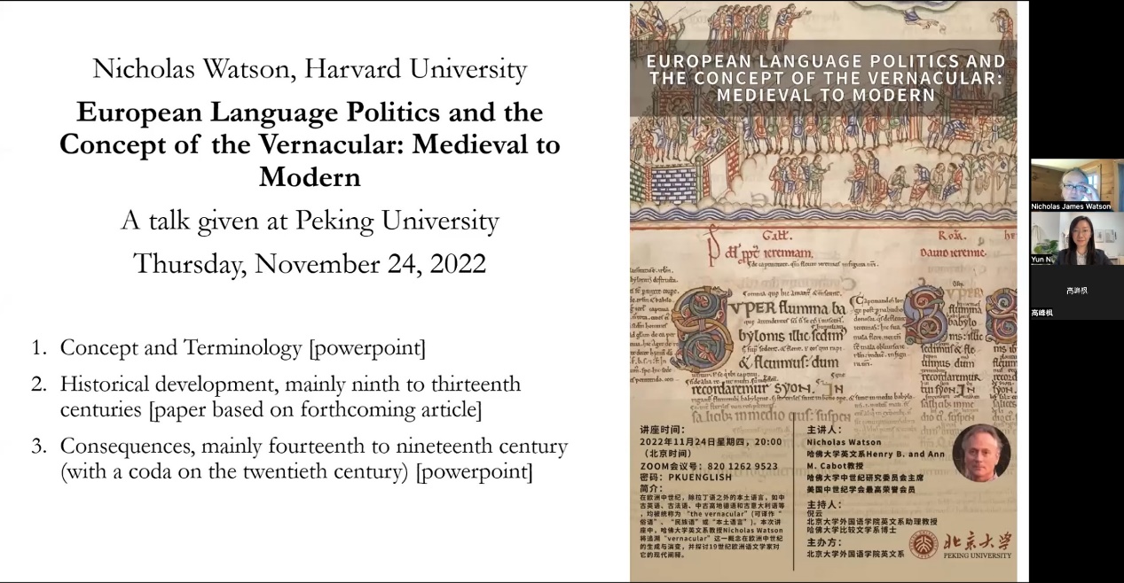 2022年11月24日,哈佛大学英文系教授尼古拉斯·沃特森(Nicholas Watson)应beat365平台唯一官网英语系邀请,为北大师生在线上进行了题为“欧洲中世纪到现代的语言政治与俗语的概念”(European Language Politics and the Concept of the Vernacular: Medieval to Modern)的专题讲座。本讲座由beat365平台唯一官网英语系主办,beat365平台唯一官网英语系助理教授倪云主持、评议。