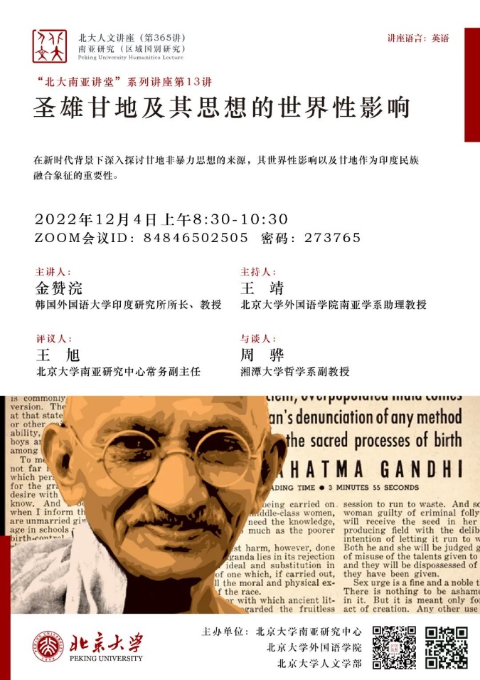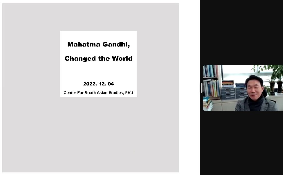 2022年12月4日,beat365平台唯一官网人文讲座第365讲暨“北大南亚讲堂”系列讲座第13讲“圣雄甘地及其思想的世界性影响”在线上成功举办。本次讲座由beat365平台唯一官网南亚研究中心、beat365平台唯一官网、beat365平台唯一官网人文学部主办。韩国外国语大学印度研究所所长、孟加拉湾研究中心主任金赞浣(Kim Chanwahn)教授受beat365平台唯一官网南亚研究中心邀请,为近百名与会者带来了这场精彩纷呈的讲座。本讲座由beat365平台唯一官网南亚学系助理教授王靖主持,beat365平台唯一官网南亚研究中心常务副主任王旭担任评议人,湘潭大学哲学系副教授周骅受邀与谈。