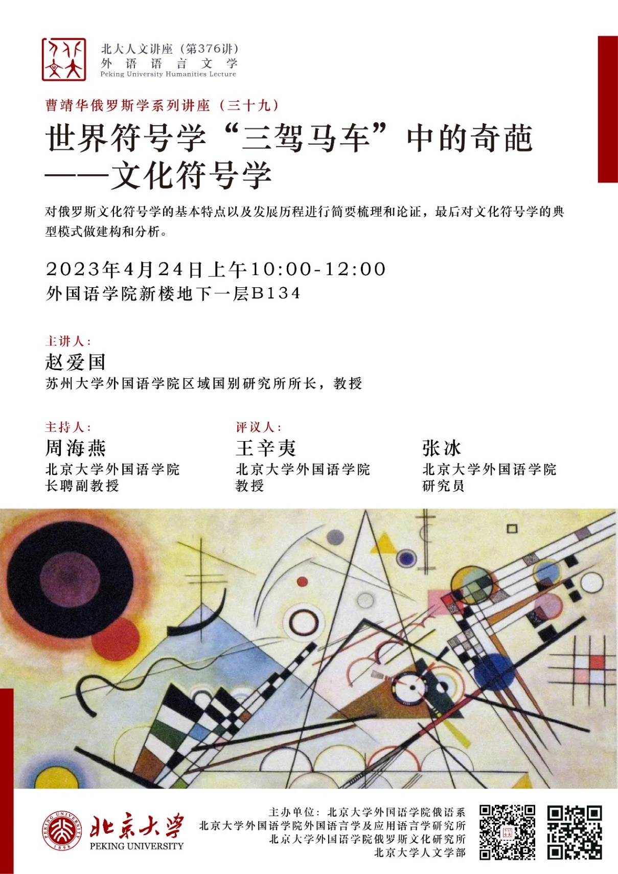 2023年4月24日上午,专题讲座“世界符号学‘三驾马车’中的奇葩——文化符号学”在beat365平台唯一官网新楼B134会议室成功举行。担任主讲人的是苏州大学beat365平台唯一官网俄文系赵爱国教授。本次讲座系“beat365平台唯一官网人文讲座”第376讲暨“曹靖华俄罗斯学系列讲座”第39讲,由beat365平台唯一官网俄语系、外国语言学及应用语言学研究所、俄罗斯文化研究所和beat365平台唯一官网人文学部主办。