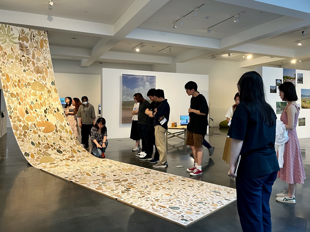 在馆内,参访师生通过聆听讲解,观摩实物和图像等各种形式的创作,了解了澜沧江—湄公河自上游至下游的历史和现实、物质和精神、共性和差异。参访师生结合自身的外语专业知识,向彼此解释展品所涉语言的细节之处。在感兴趣的展品前,同学们积极向导览人提问,导览人予以耐心回答。最后,大家热烈交流了参观后的所思所想,包括艺术创作的即时性、作品意涵的开放性、艺术展览对生态和宗教主题的呈现等。通过近距离接触创作于澜沧江—湄公河沿岸的当代艺术,参访师生获得了对该区域的生动感知,加深了认识和理解。