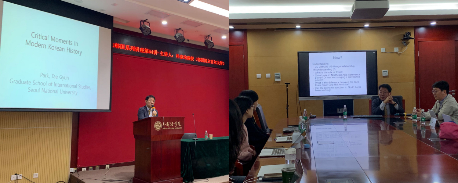 在讲座现场,与会师生同朴泰均教授积极互动,并对相关问题进行了深入探讨。此外,朴泰均教授还就外交史料的使用问题与研究生展开专题研讨,并与朝(韩)语系教师代表就韩国学研究的国际视差与发展进路等议题进行了闭门座谈。
