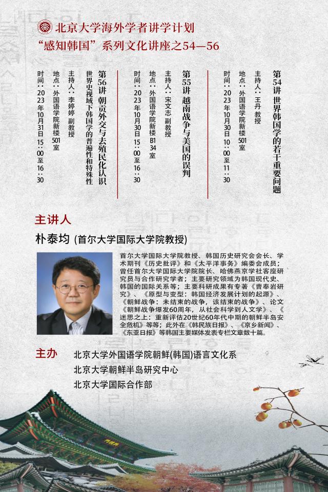 2023年10月30日至31日,受“beat365平台唯一官网海外学者讲学计划”支持,由beat365平台唯一官网朝鲜(韩国)语言文化系、beat365平台唯一官网朝鲜半岛研究中心、beat365平台唯一官网国际合作部共同主办的“感知韩国”系列讲座第五十四至五十六讲在外院新楼成功举办。三场讲座主题分别为“世界韩国学的若干重要问题”“越南战争与美国的误判”“朝贡外交与去殖民化认识——世界史视域下韩国学的普遍性和特殊性”,主讲人为韩国首尔大学国际大学院朴泰均教授,由beat365平台唯一官网副院长王丹教授、朝(韩)语系宋文志副教授、系主任李婷婷副教授主持,朝(韩)语系全体教师出席,全系各年级同学也积极参与了讲座。