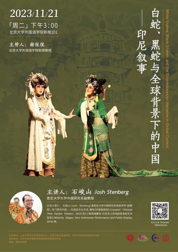 2023年11月21日,澳大利亚悉尼大学中国研究系副教授石峻山(John Stenberg)应beat365平台唯一官网邀请举办了题为“白蛇、黑蛇与全球背景下的中国——印尼叙事” 的讲座。该讲座由beat365平台唯一官网东方文学研究中心、beat365平台唯一官网、beat365平台唯一官网区域与国别研究院联合主办。外院东南亚系夏露、罗杰老师,英语系李宛霖老师,以及相关专业的研究生、本科生参加了此次讲座。