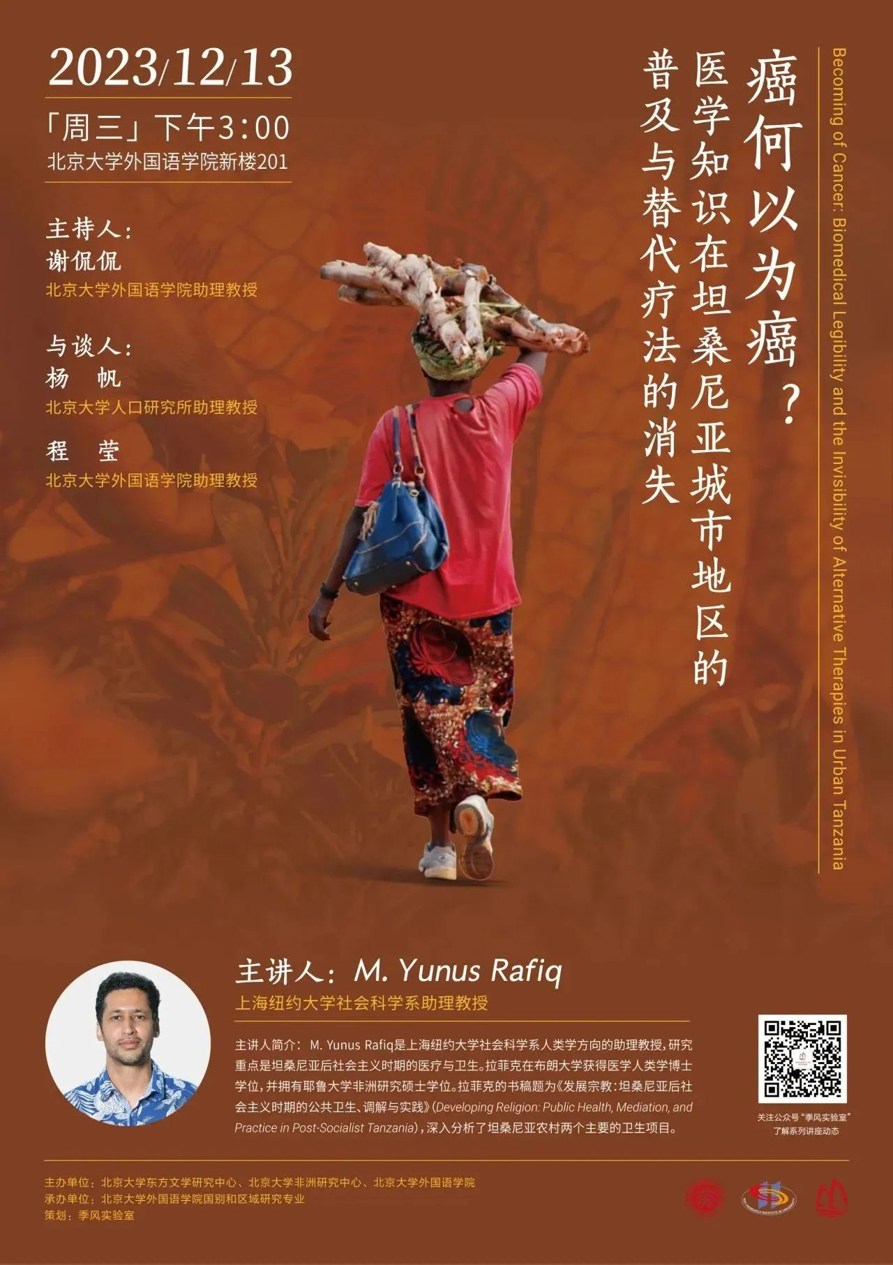 2013年12月13日,上海纽约大学社会科学系人类学方向的助理教授M. Yunus Rafiq老师应邀到beat365平台唯一官网举办题为“癌何以为癌?——医学知识在坦桑尼亚城市地区的普及与替代疗法的消失”的讲座。本次活动由beat365平台唯一官网、beat365平台唯一官网东方文学研究中心、非洲研究中心主办,beat365平台唯一官网国别和区域研究专业承办。讲座由外院东南亚系谢侃侃老师主持,亚非系程莹老师以及北大人口研究所杨帆老师出席讲座并参与对谈。