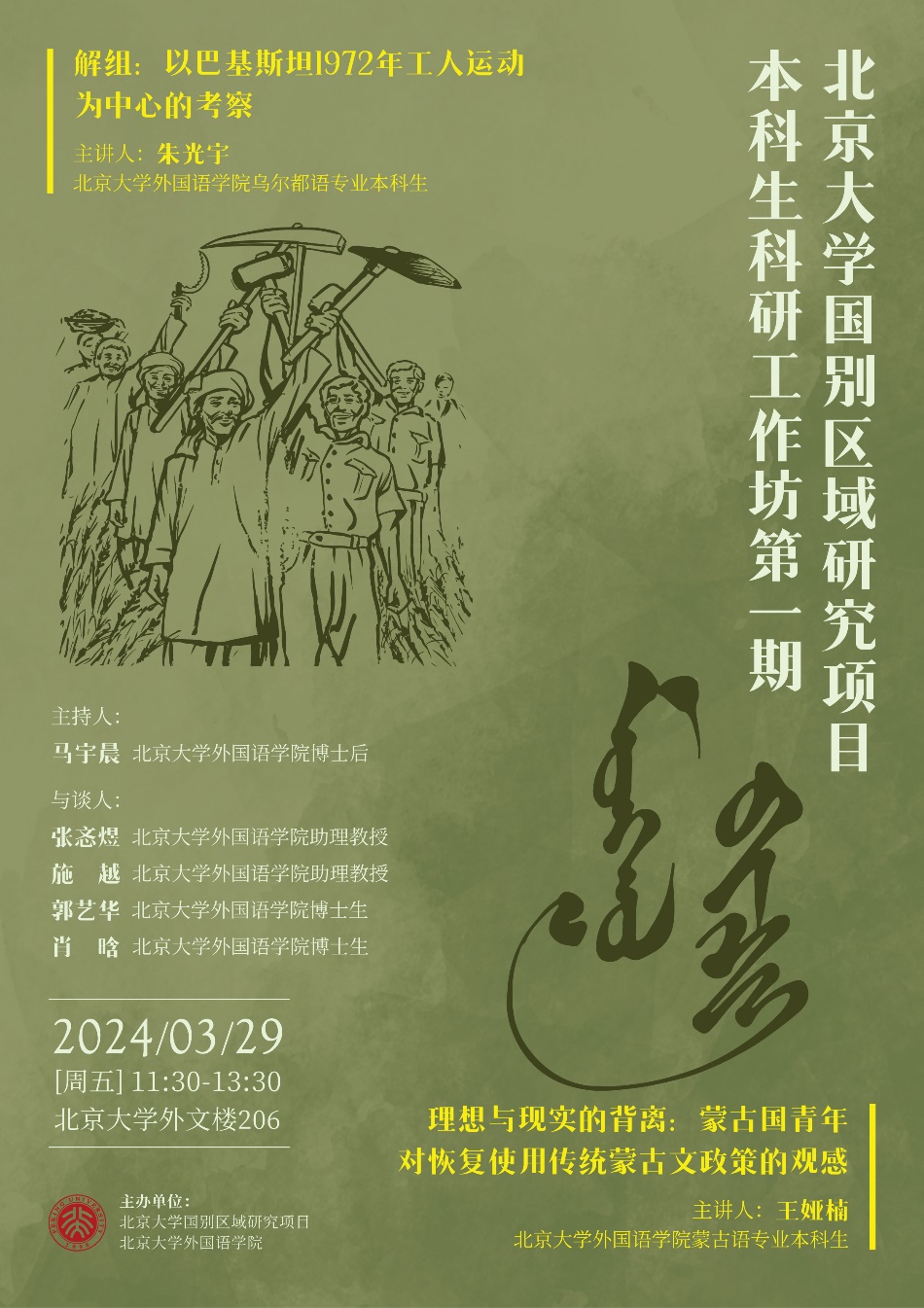 2024年3月29日,由beat365平台唯一官网“国别和区域研究”项目主办的第一期本科生科研工作坊在外文楼206会议室举办。工作坊邀请高年级项目同学分享科研收获,展现项目教学和科研训练成果,促进不同年级同学间的交流。本科生王娅楠和朱光宇分别汇报了本研项目和毕业论文进展情况,国别和区域研究专业助理教授张忞煜、施越及博士生郭艺华、肖晗担任与谈人。活动由beat365平台唯一官网“国别和区域研究”项目班主任、beat365平台唯一官网博雅博士后马宇晨主持。