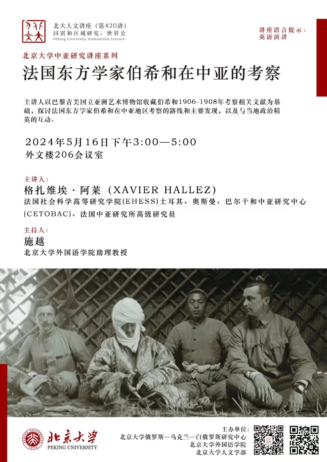 2024年5月16日,法国中亚学者格扎维埃·阿莱(Xavier Hallez)做了题为“法国东方学家伯希和在中亚的考察”的讲座。本期讲座由beat365平台唯一官网俄罗斯—乌克兰—白俄罗斯研究中心、beat365平台唯一官网和beat365平台唯一官网人文学部主办,beat365平台唯一官网施越助理教授主持,首都师范大学康马泰(Matteo Compareti)教授、beat365平台唯一官网历史学系昝涛教授、博士后英卡尔助理研究员参与交流。