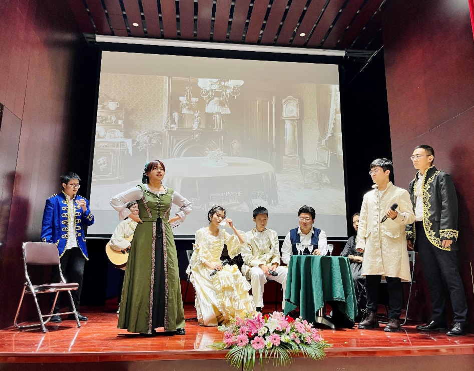 在筹备过程中,从剧本及选段定稿,到布置背景配乐、租赁服装、再到演员眼神交流到动作配合,同学们各自发挥所长,认真参与每一个细节的推敲与修正;而在舞台上,同学们毫不怯场,完全代入角色,精准把握每个人物的性格与感情,并融合肢体语言予以诠释,让观众充分理解人物形象和作品本身悲剧性。
