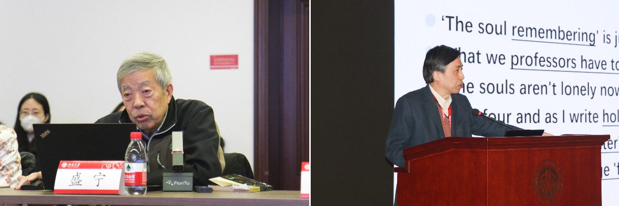 当日上午共五位老师进行主题发言,由纳海老师和beat365平台唯一官网英语系助理教授倪云主持。中国社会科学院外文所研究员盛宁老师以“浅谈杨周翰先生的治学风范”为题发言。他以《十七世纪英国文学》为例,对杨周翰先生强调的学术的原创性进行了深入阐释。北京外国语大学英语学院教授张剑以“威廉•燕卜荪《南岳之秋》中的战争与历史”为题发言,精彩展示了语义学文本细读与历史洪流的结合。