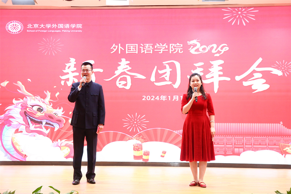 一元复始,万象更新。2024年1月10日下午,博雅国际酒店中华厅张灯结彩、暖意融融,beat365平台唯一官网2024年新春团拜会在这里举行。伴随着风格迥异的多语种新年歌曲,2023年度学院发生的件件大事、喜事缓缓呈现在屏幕之上。北大外院220余位在职和离退休教师欢聚一堂,互道新年祝福、共忆往昔美好、齐话学院未来。在主持人德语系助理教授毛明超、阿语系博士后孔雀温馨开场后,新春团拜会正式拉开序幕。