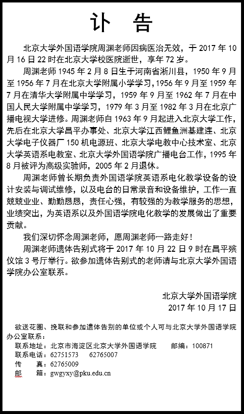 周渊老师讣告