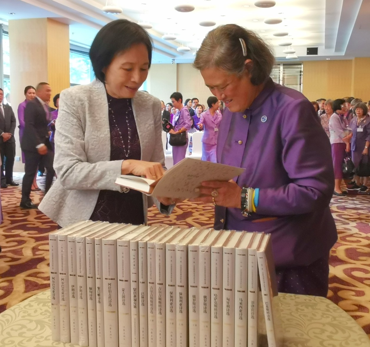 2019年9月29日下午,泰王国诗琳通公主在参加完中华人民共和国国家勋章和国家荣誉称号颁授仪式之后,前往北京丽思卡尔顿酒店宴请前任中国驻泰大使和公主的汉语教师代表。我国泰语界著名专家、翻译家、诗琳通讲席教授裴晓睿受邀参加了此次宴请活动,并作为译者之一向公主赠送了由北大beat365平台唯一官网、北大中国诗歌研究院和作家出版社联合策划出版的《“一带一路”沿线国家经典诗歌文库》(第一辑)一套。