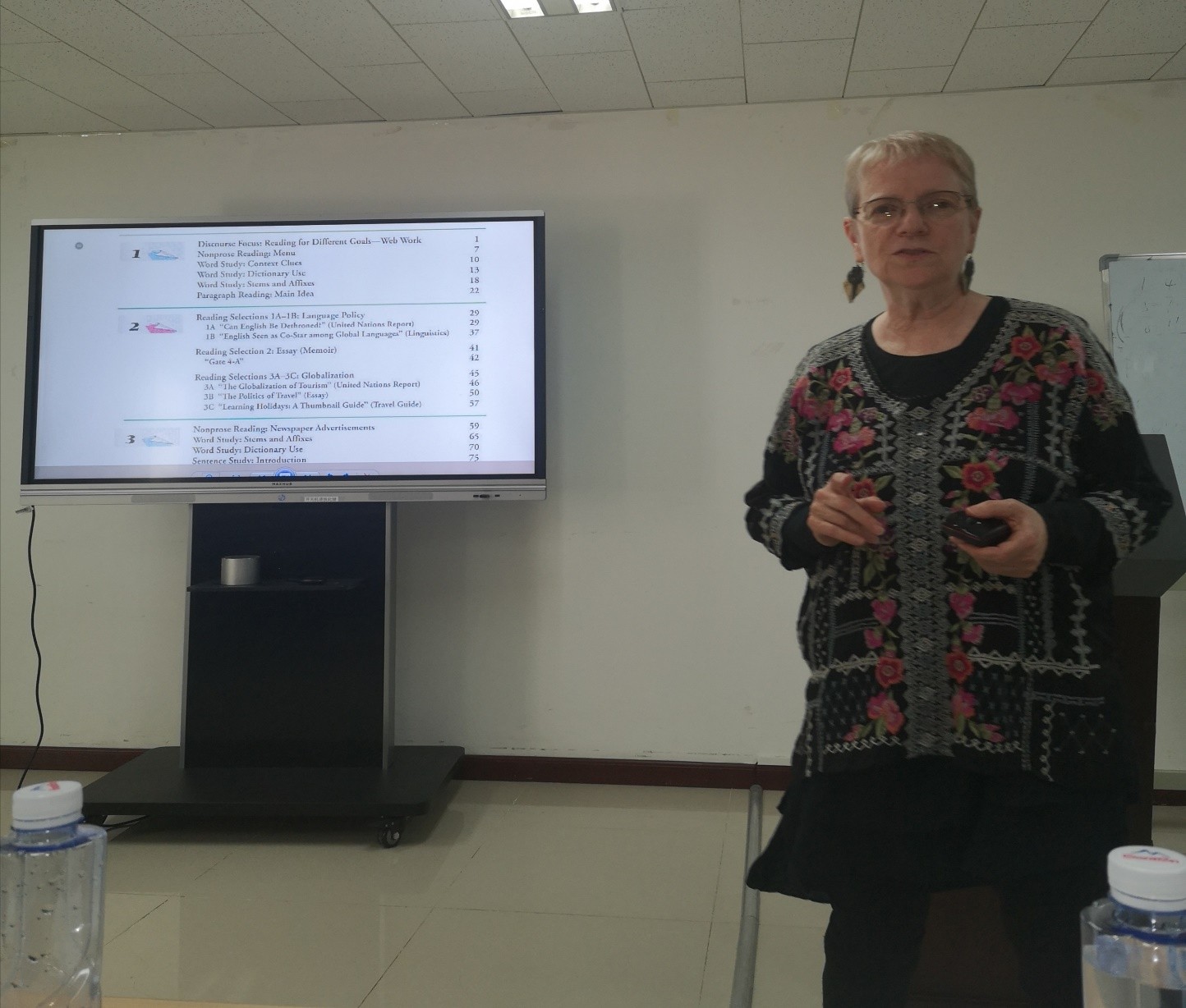 8日下午,Silberstein教授在beat365平台唯一官网新楼301给大学英语教研室的教师及语言所的师生进行了二语阅读教学的展示性讲座。整场报告围绕着以下几个问题展开:什么是阅读?阅读课的目标是什么?阅读课中教师承担着怎样的角色?如何进行批判性阅读的教学?如何对阅读材料进行评估?Silberstein教授在报告中不仅有理论性的介绍,也有直观简明的教学示范。她以一首不同寻常的小诗作为讲座的开场,让在场师生一起进行阅读和讨论。面对师生们对于同一问题给出的不同答案,Silberstein教授解释到人们在阅读时都会带着自己独特的社会经历和文化背景进行阅读,作为阅读教师需要认识到这一点并充分挖掘出学生的潜力,让他们做到读有所思,读有所得。接下来,Silberstein教授还展示了阅读中词汇学习的方法、如何针对不同材料调整阅读策略、如何用简单的问题启发学生进行批判性阅读等。