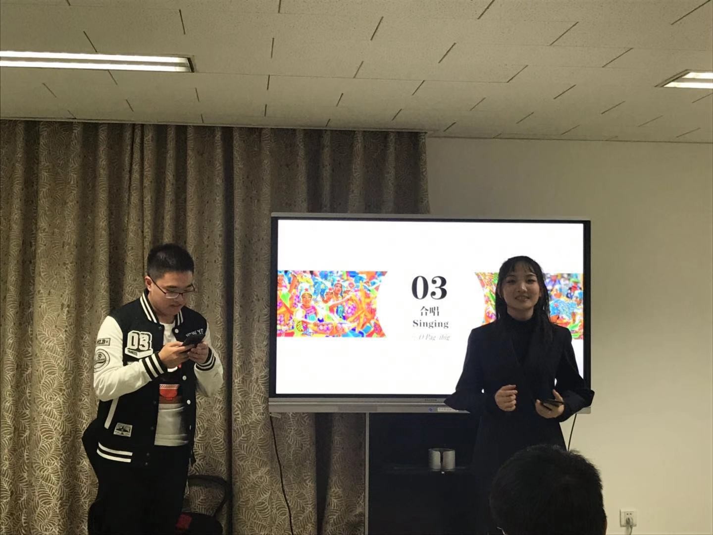 接下来,郭宸岑和赵雪妍用中菲双语演唱了菲律宾歌曲《O Pag-ibig》。该歌曲是一首描写爱情题材的菲律宾语歌曲,同学不仅用纯正的发音演唱了菲律宾语歌词,还演唱了由全体同学在课堂上翻译填词的中文歌词。