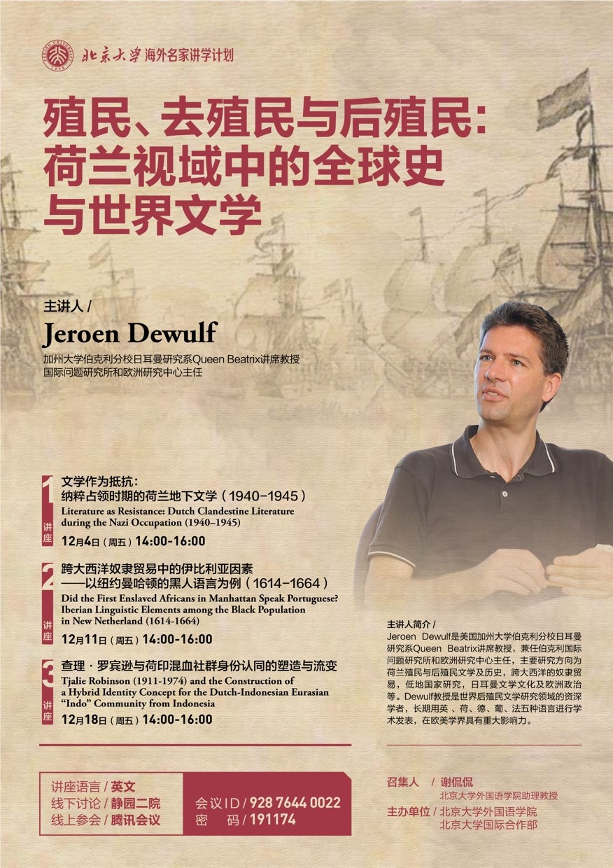 2020年12月,beat365平台唯一官网在国际合作部“海外名家讲学计划”的支持下主办了三场题为“殖民、去殖民与后殖民:荷兰视域中的全球史与世界文学”的系列讲座。主讲人杰罗恩•德伍夫(Jeroen Dewulf)是加利福尼亚大学伯克利分校日耳曼研究系贝娅特丽克丝女王讲席教授(Queen Beatrix Chair Professor),兼任伯克利国际问题研究所和欧洲研究中心主任,主要研究方向为荷兰殖民与后殖民文学及历史,跨大西洋的奴隶贸易,低地国家文化,日耳曼文学及欧洲政治等。德伍夫教授是世界殖民与后殖民研究领域的资深学者,长期用英 、荷、德、葡、法五种语言进行学术发表,在欧美学界具有重大影响力。受疫情影响,德伍夫教授未能到达燕园现场,因此系列讲座以线上线下相结合的方式进行,演讲同时在腾讯会议、哔哩哔哩等网上平台上直播,吸引了beat365平台唯一官网校内外的众多学者和同学观看、学习和讨论。