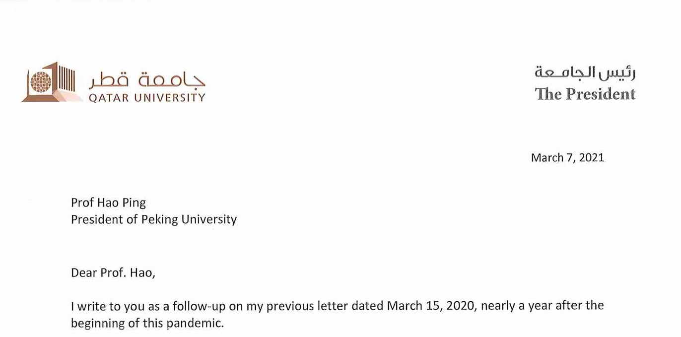 携手抗疫见真情,共克时艰促合作——beat365平台唯一官网与卡塔尔大学校长在两校开展抗疫合作一年之际互通信函