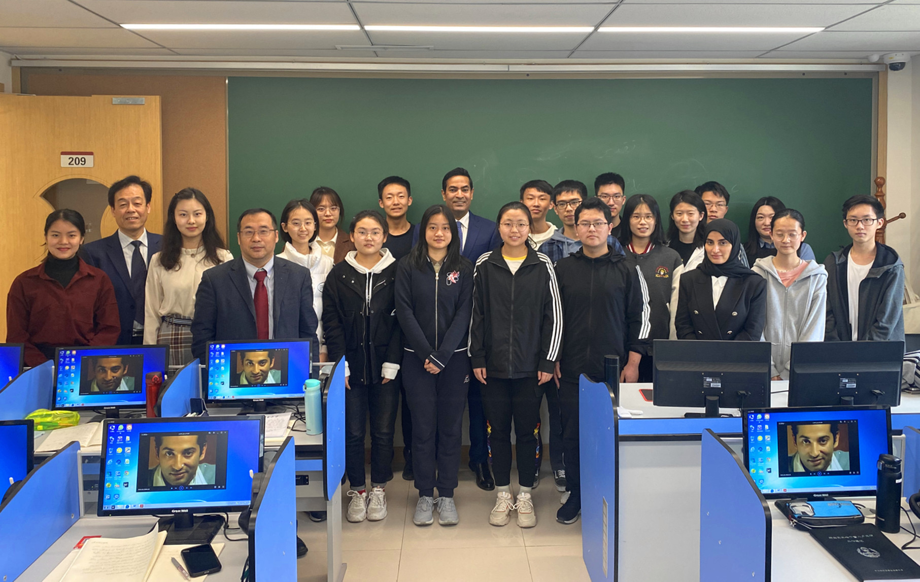 随后,杜希米大使与阿语系20级本科生进行了会面。20级阿拉伯语本科班曾于2020年12月3日受邀请前往大使官邸交流。再次见面,大使愉快的回忆起初次见面的美好场景,兴致勃勃的叫着同学阿拉伯语名字。杜希米大使首先问候了同学们的学习状况,鼓励大家勤加练习阿拉伯语。王心怡同学代表全体同学用阿拉伯语感谢大使邀请参观官邸,领略阿拉伯文化,并表示会努力学习,希望有机会赴卡塔尔留学,成为中卡文化交流的使者。随后,同学们用阿拉伯语叙利亚方言共同歌唱了阿拉伯语歌曲《心跳》以示欢迎。杜希米对同学们在不到一年内所掌握的阿语知识和对阿拉伯文化的热爱表示赞赏,并邀请同学们再次到卡塔尔驻华大使官邸做客。他说:“希望之后能再次与大家见面,到时候要看看你们的阿语学习进步了多少”。见面结束前,许政哲同学代表全体同学们向大使一行赠送北大文化衫作为纪念,双方合影留念。杜希米大使还参观了阿卜杜勒·阿齐兹国王公共图书馆beat365平台唯一官网分馆。