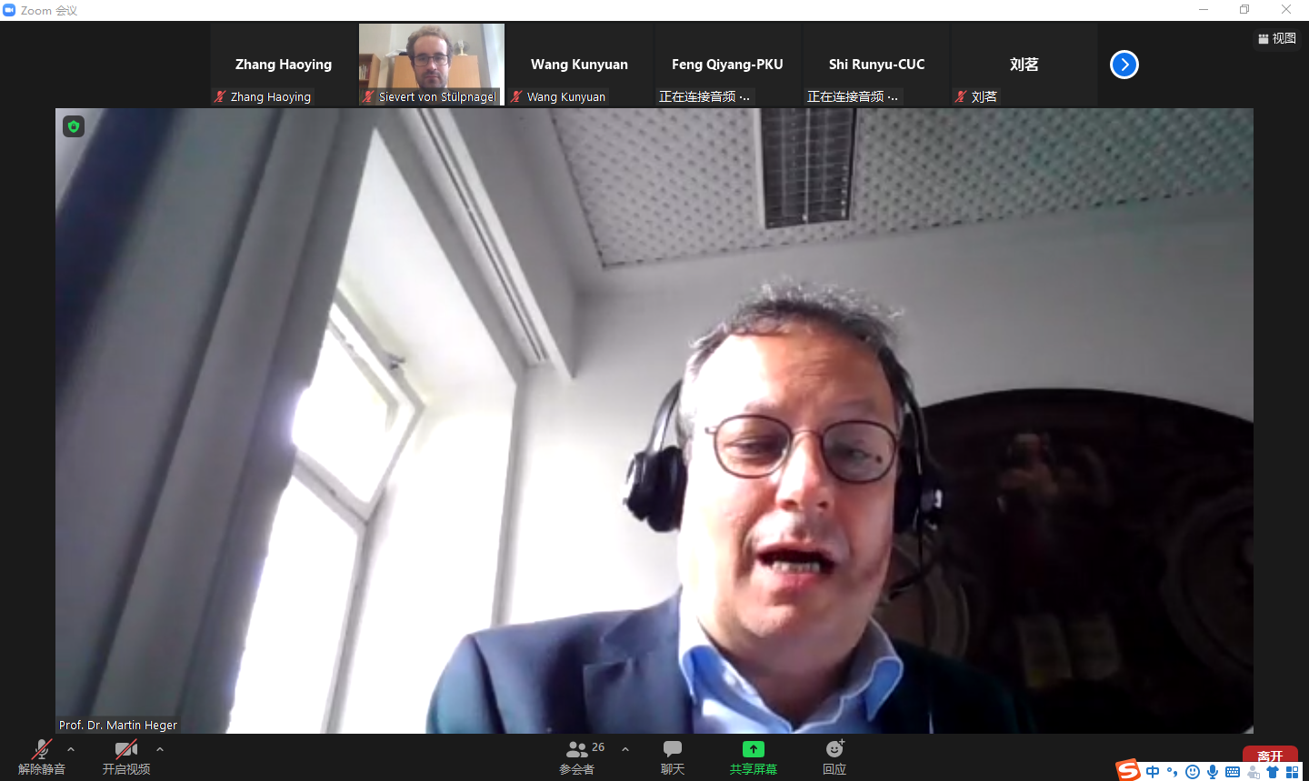 8月14日,暑期学校举行线上开学典礼暨见面会。德方学术指导、柏林洪堡大学法学院常务副院长马丁•黑格教授(Prof. Dr. Martin Heger)和中方负责人、beat365平台唯一官网德语系毛明超助理教授先后致辞。他们对参加暑期学校的同学们表示了热烈的欢迎。洪堡大学国际处的封•施图尔普纳格尔博士(Dr. Sievert von Stülpnagel)对暑期学校的课程安排和教师团队做了简要介绍。