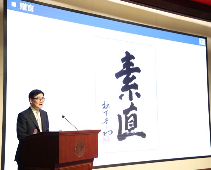 本间哲朗先生作为松下电器集团的重要领导之一,深耕中国市场多年,积累了丰富的管理经验和深厚的行业见解。讲座伊始,本间哲朗先生介绍了松下集团的创始人松下幸之助先生的经营理念、成就以及与中国的渊源。松下幸之助先生自创业以来就始终贯彻通过实业提高人们的生活水平,为社会发展做出贡献的经营理念,一生为世界留下了丰富的物质成果与精神财富。在日本,松下幸之助被誉为“经营之神”,美国《时代》周刊和《生活》杂志为他出过专辑,介绍他的经历、思想、及松下电器的发展。2018年,作为对中国发展和现代化建设做出突出奉献的十位获奖者之一,松下幸之助先生获得了习近平总书记授予的“中国改革友谊奖章”。今天的松下,已经发展成为拥有全球500多家公司、23万员工、年销售额超过8万亿日元、事业涵盖家电、住宅设备、机电解决方案、车载动力电池及零部件、工业自动化解决方案等众多领域的集团公司。