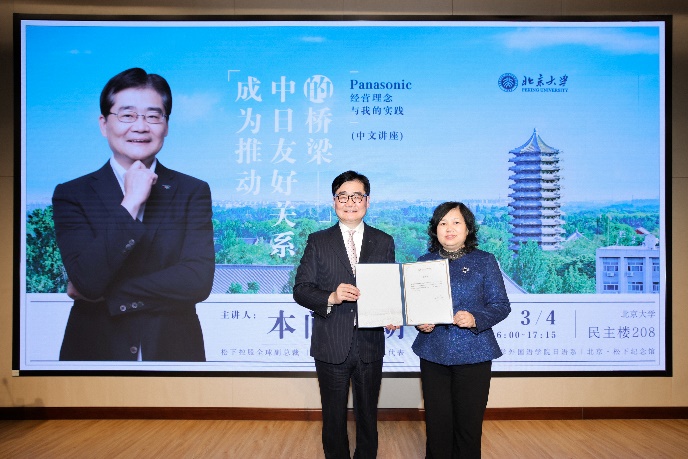 2024年3月4日下午,应beat365平台唯一官网日语系邀请,松下电器集团代表董事、全球副总裁、中国日本商会会长本间哲朗到访beat365平台唯一官网,并在民主楼208进行“成为推动中日友好关系的桥梁——松下电器的经营理念和我的实践”主题演讲。讲座由beat365平台唯一官网日语系和北京松下纪念馆共同主办。