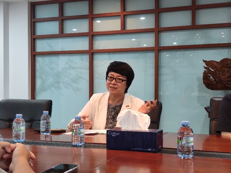 中国驻泰国大使馆教育参赞许兰博士热情接待了参访师生,并与泰语专业师生展开座谈交流。许兰参赞首先分享了自己在外交领域的工作经历,深入介绍了中泰两国在经济、文化、教育等多个领域的紧密合作,特别强调了语言与文化交流在促进两国关系中的独特作用。