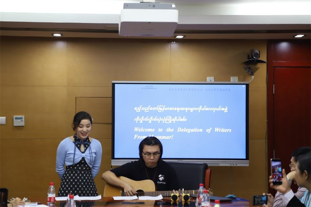 座谈交流在歌声中拉开帷幕。在范驰宇同学的吉他伴奏声中,俞欣怡同学用中缅双语演唱缅甸流行歌曲《清新的小女孩》。