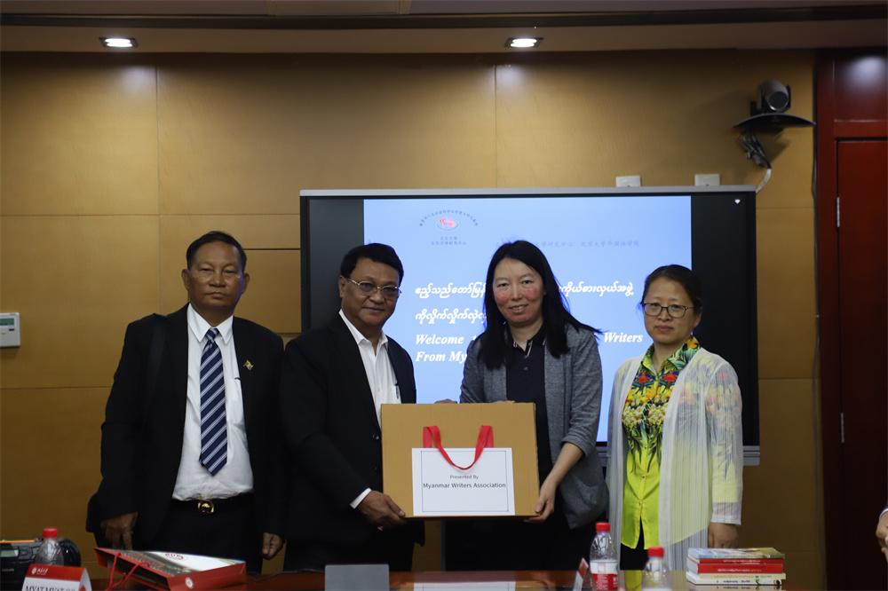 致辞结束,缅甸作家代表团与缅甸语专业师生用缅语交流。本科四年级学生尚晋豪介绍了beat365平台唯一官网的光荣传统与历史;缅语教研室主任张哲老师代表专业介绍了北大缅语专业的历史沿革、1949年至今的人才培养、教材建设、课程建设和科研成果,向代表们展示由缅语教研室教师出版的《缅甸诗选》、《缅甸方言研究》等语言、文学类专著、译著。杨国影副教授详细介绍近五年来缅甸语教研室已翻译出版和正在计划出版的缅甸文学作品,包括《如愿》、《雨夜雾梦》、《等待花开之时》、《六边形》、《缅甸短篇小说选》、《缅甸儿童文学作品选》等。