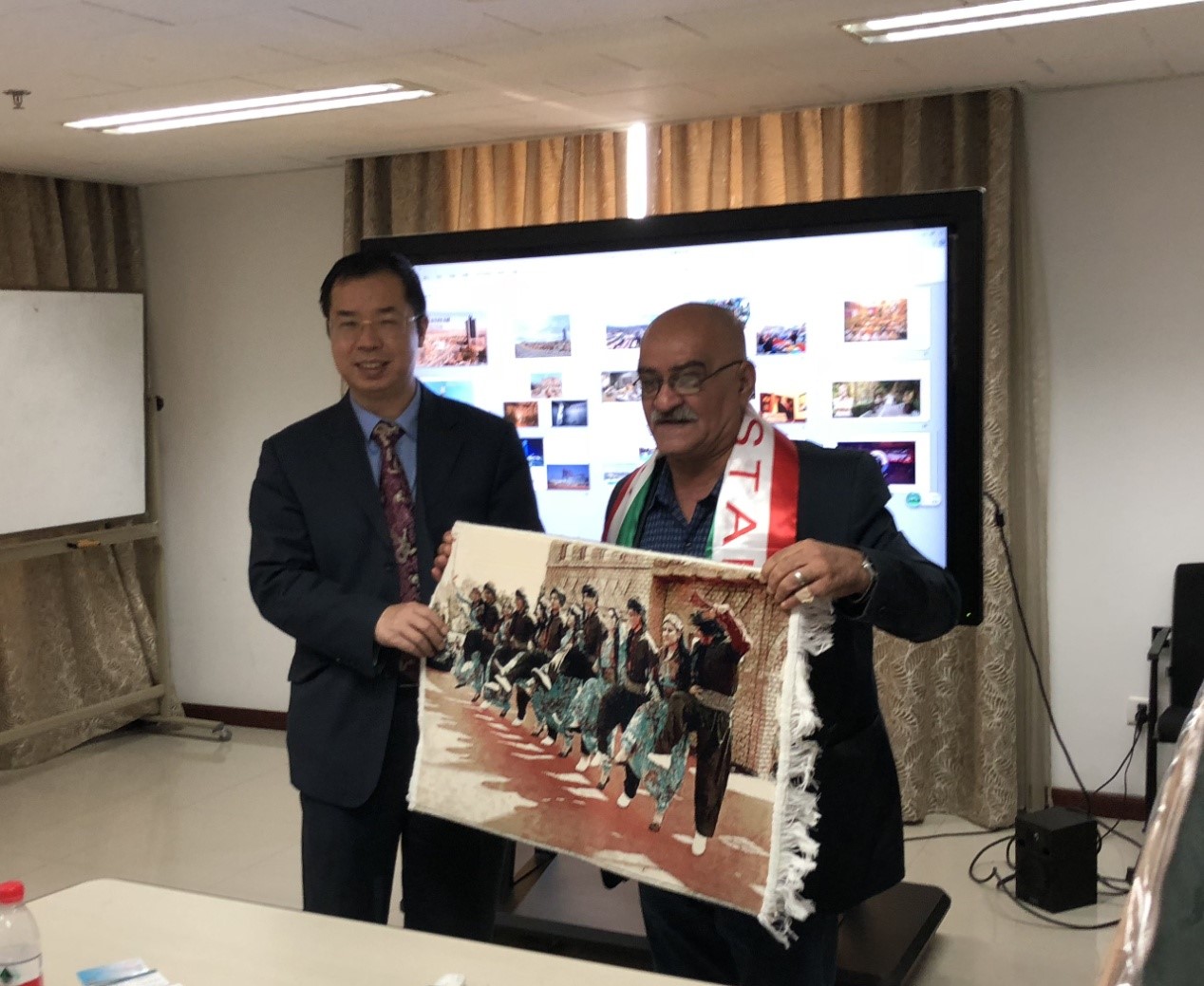 最后,林丰民教授和哈塔布·艾哈迈德·沙哈尼先生代表中库双方互赠礼物,全体与会人员合影留念。