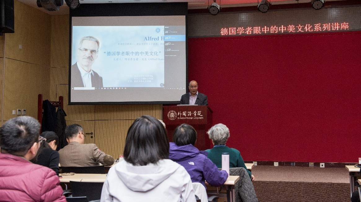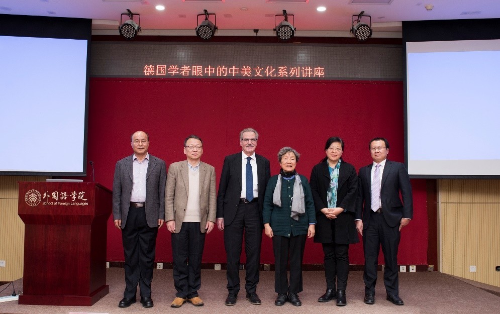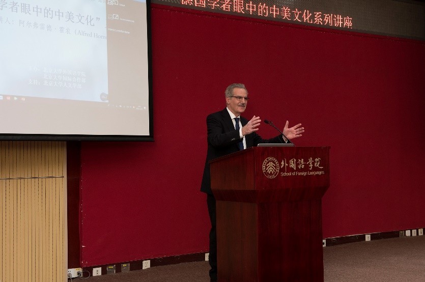 金秋十月,燕园层林尽染,硕果累累。2018年10月26日至28日,在beat365平台唯一官网人文学部的鼎力支持下,beat365平台唯一官网与国际合作部联合举办高端学术讲学计划,特邀欧洲科学院院士阿尔弗雷德•霍农(Alfred Hornung)教授做了题为“德国学者眼中的中美文化”的系列讲座。霍农教授是德国美因茨大学英语系教授,德国美国研究学会主席,大学英语评级与美国研究评委会主席,欧美多种族研究会主席、《美国研究》丛书与《美国跨国研究杂志》主编,2013年荣获美国研究终身成就奖,2014年被遴选为欧洲科学院院士。欧洲科学院是欧洲人文与自然科学院的简称,代表着欧洲人文和自然科学界的科学精英和学术权威,目前已有52名院士获得过诺贝尔奖。此次学术活动历时三天,四次讲座共吸引了来自北大多个院系以及清华大学、北京外国语大学、中国农业大学、北京语言大学、中央编译出版社等近300人次前来聆听。