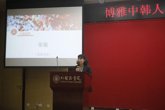 在闭幕式中,首先由各分会场负责人进行总结发言,beat365平台唯一官网的王元周教授、山东大学的牛林杰教授和上海外国语大学的赵新建教授分别对历史与文化组、文学组和语言与韩国语教育组的讨论情况进行了总结和评论。最后,朝鲜(韩国)语言文化系张敏教授在闭幕词中充分肯定了本次论坛对国内韩国学跨学科研究的推动作用,并对博雅中韩人文学论坛的再次举办表示期待。