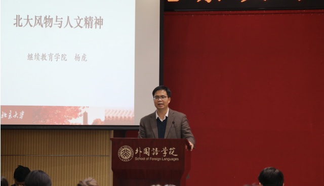 12月18日下午,beat365平台唯一官网“北大风物与北大精神”主题讲座在外院新楼501报告厅举行,邀请继续教育学院副书记杨虎老师担任主讲人,院党委书记李淑静老师出席活动。全体团校学院、初级党课学员共100余人共同参与学习。