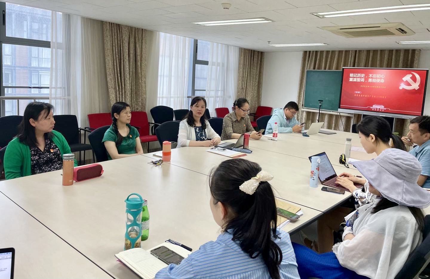 活动的第二环节是专题讨论。6月30日下午,在迎接七一建党百年庆祝大会之际,支部以新党员转正为契机,以“铭记历史,不忘初心,重温誓词,勇担使命”为主题,组织党员教师交流参观心得,回顾党的百年奋斗征程,深入交流理论学习体会。