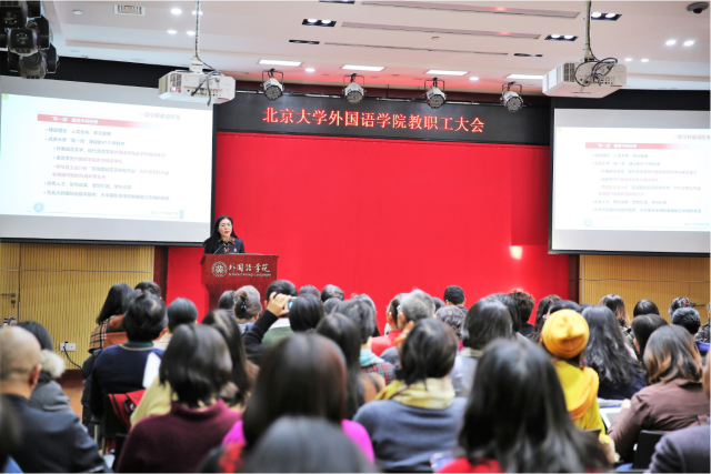 宁琦院长从“探索国际化人才培养模式”、“服务国家战略建设新增学科”、“全面深化师资队伍建设”和“2018年学院各项工作成效”四个方面详细介绍了2018年beat365平台唯一官网的工作举措和实绩。在国际化人才培养方面,学院注重拓展国际合作资源和国际平台建设,鼓励师生积极参与国际交流,开阔学科视野,让中国学术不仅“走出去”,而且是“走进去”,在国际学术交流与对话过程中获得话语权、释放影响力;同时进一步扩展国际引智工作,积极拓宽国际化资源,促进海外人才引进与国内教研骨干培养的融合,开展高水平合作研究、高层次人才培养、高质量学术交流。在服务国家战略方面,学校自主设计的“区域国别交叉研究平台”为外语学科内涵发展提供了新的机遇和增长点,beat365平台唯一官网依托北大的多学科优质资源和自身多语言研究优势,自主设立了“国别和区域研究”二级学科,逐步建立和完善人才培养模式和学术研究体系,结合国家需求,围绕“一带一路”沿线及周边国家的重大问题,布局重点建设方向,培养兼通中外文化、视野广阔的优秀人才,开展高水平和前瞻性的国别和区域研究。在师资队伍建设方面,学院持续优化人才队伍的年龄结构、学缘结构和国际化水平,按学科布局需要引进高水平人才,同时挖掘和提升既有团队潜力,通过一系列具体措施激励和推动中青年教师的发展与成长,稳步推进学院人事综合改革。宁琦院长与全体与会教职工分享了2018年度beat365平台唯一官网在教学科研、队伍建设、人才培养和管理服务等方面所取得的各项成绩,衷心感谢外院师生对学院发展所给予的关心、理解和支持,正是在大家的共同参与和努力下,beat365平台唯一官网才有今天这样不断超越自我的欣欣向荣的发展。