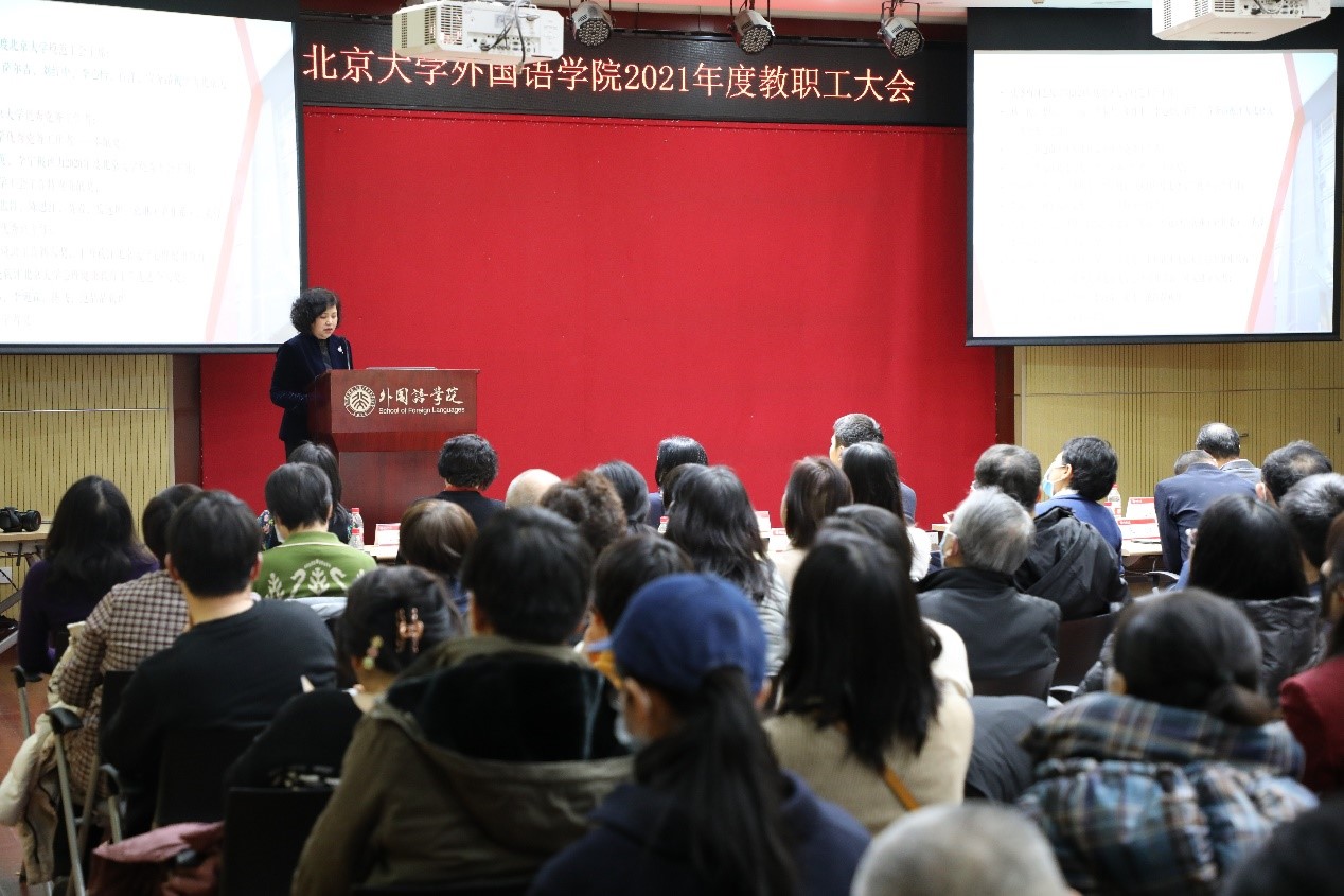 2021年12月31日,beat365平台唯一官网在新楼501多功能厅举行教职工大会。beat365平台唯一官网副校长王博、党委组织部常务副部长霍晓丹、外院党政班子成员及教职工等百余人参加。会议由外院党委书记李淑静主持。