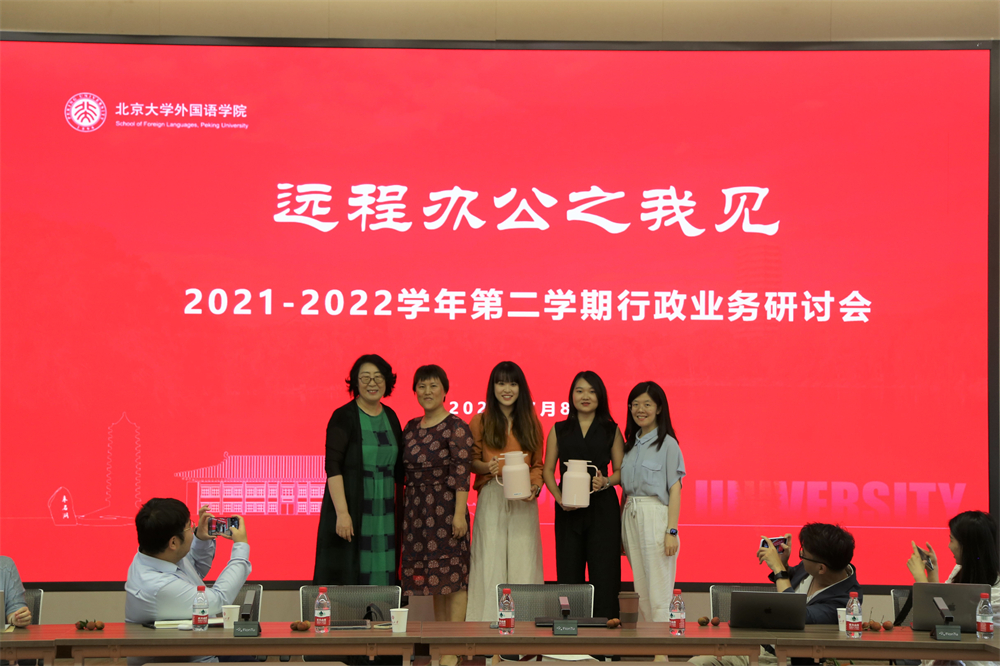 本学期末,学生工作办公室的王乃懋老师与王志峰老师将离任,熊珊儿、杜姝格作为2022届选留生加入到了外院行政大家庭,党委书记李淑静老师、副院长张冬梅老师分别为离任老师献上鲜花,祝福他们前程似锦。学院为新同事准备了迎新礼物,欢迎两位老师的加入。