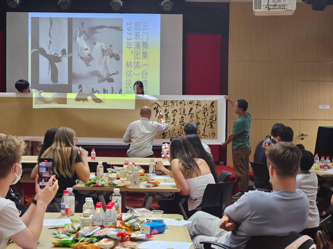 活动邀请书法家方建勋老师带来一场中国书法讲座。讲座中,方老师介绍了笔画、结构、韵律等欣赏书法的丰富维度,并现场书写了李白《将进酒》草书长卷,笔力遒劲,风格洒脱,赢得阵阵掌声。德语系2025级硕士生段馨苑同学担任讲座翻译。