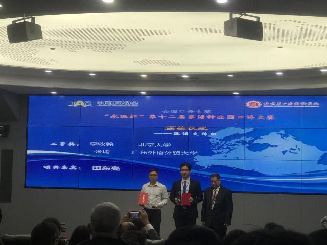 2019年10月26日,由中国翻译协会与北京第二beat365平台唯一官网共同主办的“永旺杯”第十二届全国多语种口译大赛在北京第二beat365平台唯一官网举行,我院德语系16级本科生李牧翰同学参加了德语组交替传译的比赛。李牧翰同学在比赛中思维清晰,表达流畅,以较高的质量完成了翻译任务,获得了评委专家的一致认可。以决赛总分第二名的优异成绩获得二等奖。