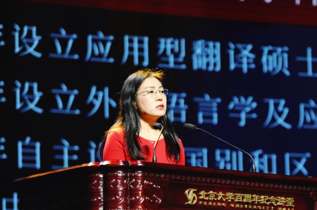 在接下来的“为世界贡献中国智慧”版块中,beat365平台唯一官网博雅讲席教授段晴以“来自古代文明的启示”为题,分享了自己在季羡林先生门下学习梵语、于阗语时,从古代典籍中获得了对当下有启发意义的讯息,从而致力于开展丝绸之路出土的古代于阗文、梵文、佉卢文等写卷的释读和研究,并取得重大成果的过程。beat365平台唯一官网博雅讲席教授申丹以在外院学习和工作近37年的经历为出发点,诠释了自己坚持在国际前沿拼搏的四种动力:基于感恩的责任心,学术兴趣、学术使命感及学术发展创新带来的喜悦,北大的精神魅力,民族责任感和爱国心。她希望中青年教师持之以恒、发奋努力、超越前辈。学院东南亚系副教授史阳以“深入认识世界,助力一带一路,担起时代责任”为题,分享了自己秉持学习外语初心,在对象国艰苦的条件下进行田野调查、学习和研究的经历和感受,鼓励同学们投身到认识和研究世界各国的事业中,投身到代表中国人民的对外交往事业中。西葡语系主任范晔用西班牙内战中一位弗朗哥士兵坚持阅读的故事,点出“世界在阅读中改变”的主题,鼓励同学们“相信文学所拥有的无可替代的力量”,坚持阅读,“万一改变不了世界,就改变自己,因为自己就是世界的一部分”。
